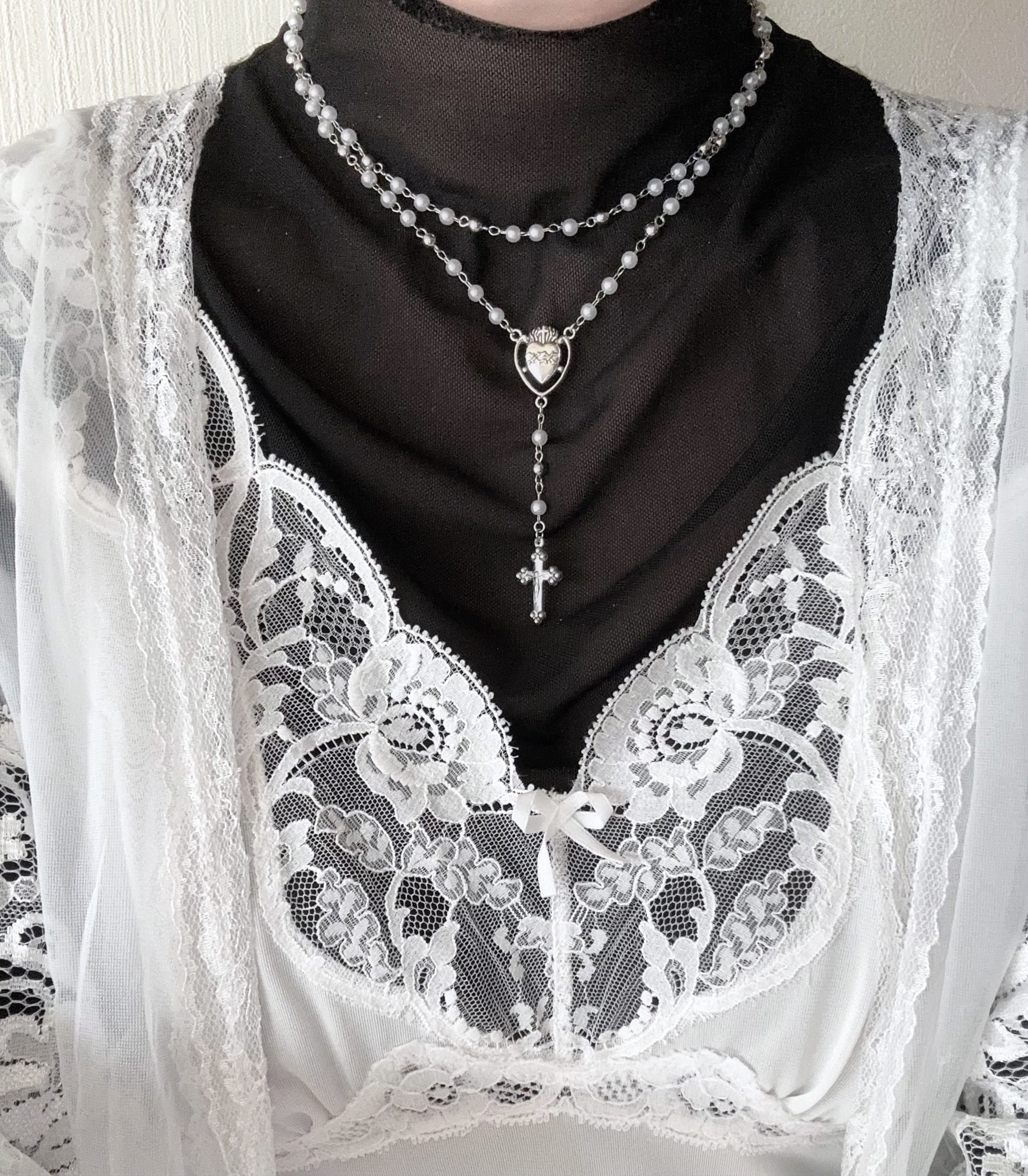 重ねづけしたようなロザリオ風ネックレスチョーカー。